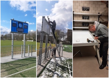 Door de storm van februari heeft ons dak en scorebord behoorlijke schade opgelopen, waardoor we nieuwe voor en achterplaten moesten bestellen. Maar door inspanning van de vrijdagmiddagploeg Guus, Hans en Remco hangt hij weer netjes in zijn frame. Jeffrey en Ferry jullie natuurlijk ook bedankt om tijdens de storm de units van het veld te …