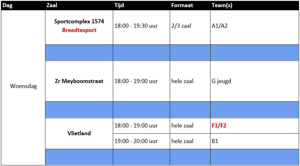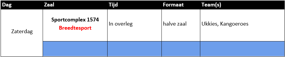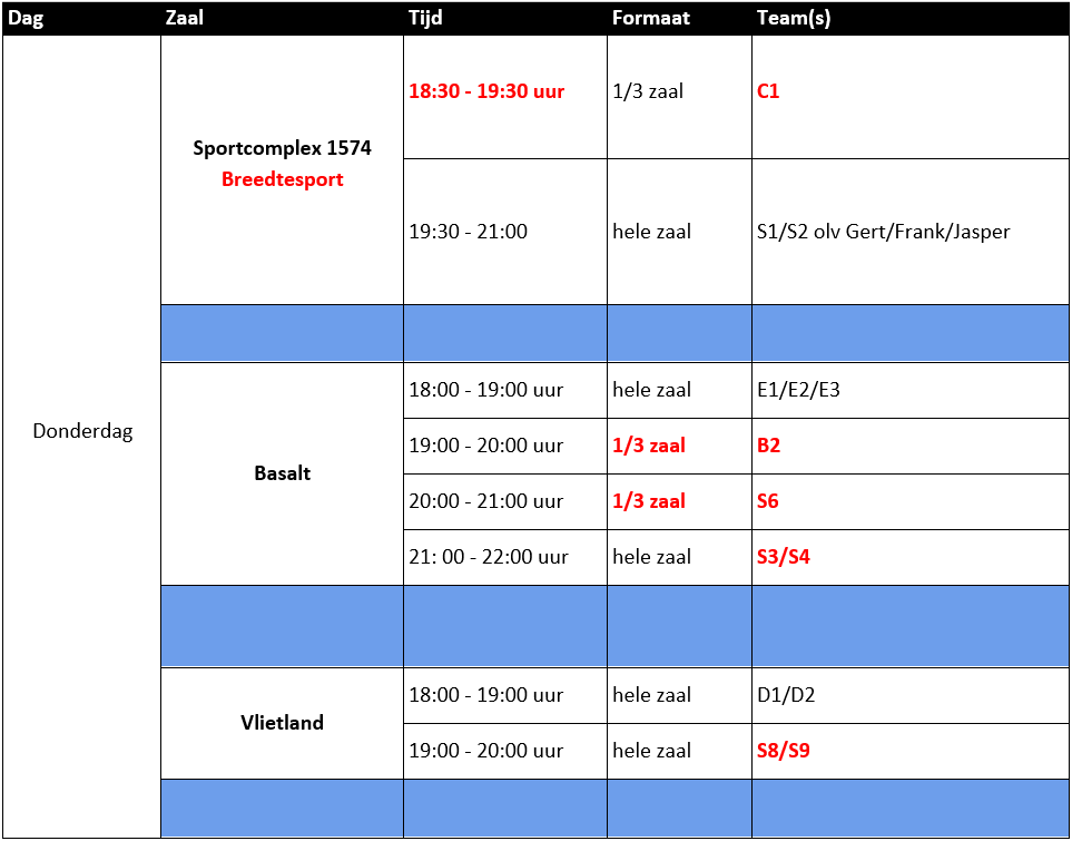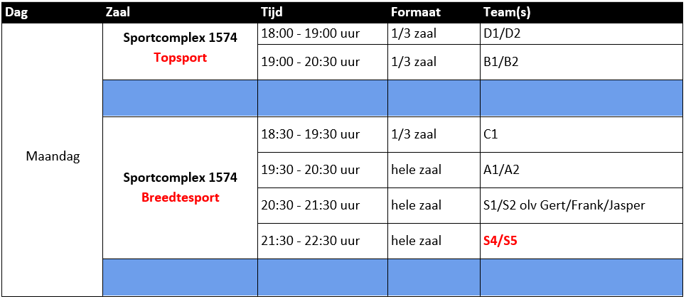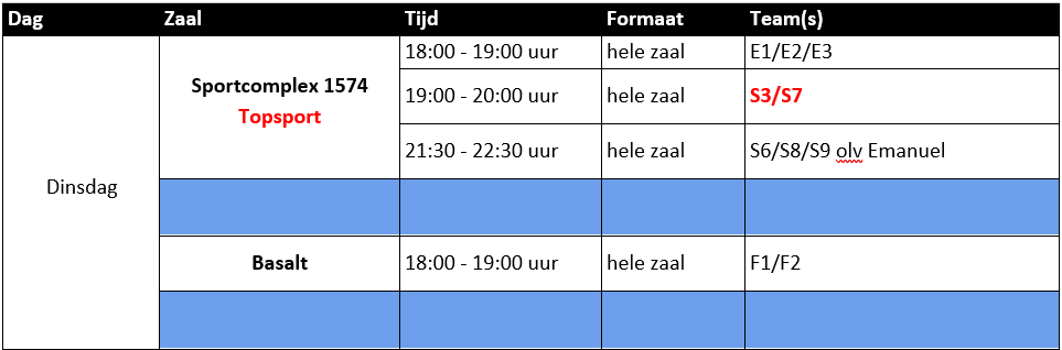 Voor Sportcomplex 1574 en Basalt geldt dat niet ieder uur voor de hele zaal geldt. Soms is voor een trainingsuur ⅓ of ⅔ zaal beschikbaar. Dit staat aangegeven in de kolom ‘Formaat’. Let ook hierop.