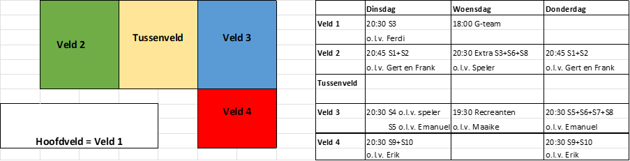 De zaal zit er bijna op en dat betekent maar één ding, we gaan weer het veld op. Komende zaterdag spelen bijna alle teams hun laatste wedstrijden in de zaal. Vanaf komende maandag, 3 april, gaan de trainingen verder op het veld. Er zijn enkele wijzigingen met betrekking tot het schema van voor de zaal. Zie onderstaand schema voor de trainingstijden.