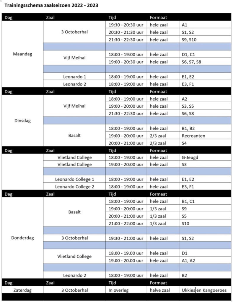 Ook dit jaar is het weer gelukt alle zaaltrainingen ingepland te krijgen. Dit is in overleg met de gemeente en andere verenigingen altijd een hele puzzel, maar alle teams hebben weer een droge en warme plek om te trainen in de wintermaanden. Vanaf 14 november wordt er uitsluitend nog binnen getraind en niet meer op het veld.