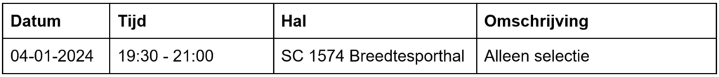 Aan het einde van de kerstvakantie zal een aantal teams een oefenwedstrijd spelen. Onderstaand het schema hiervoor.