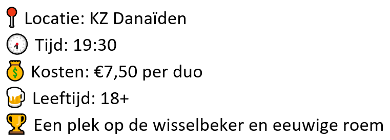 Op zaterdag 17 mei om 19:30 is het zover: hét bierpong toernooi bij KZ Danaïden! Trommel je team op, perfectioneer je worp en maak je klaar voor een avond vol strijd en gezelligheid!
