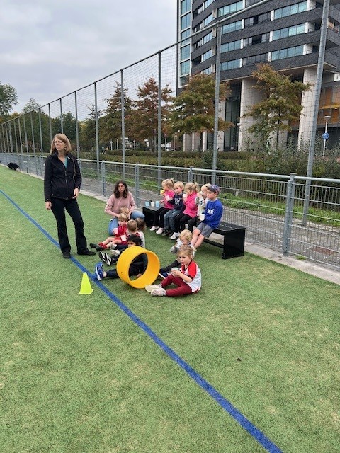 We zijn erg druk bezig geweest: eerst tikkertje met een wolf en biggetjes, doelpunten maken en daarna de gehaktballenrace. Iedereen was moe, maar toen moesten de kids toch nog twee rondjes rennen, springen en vliegen. Slavendrijver, die opa Erik….