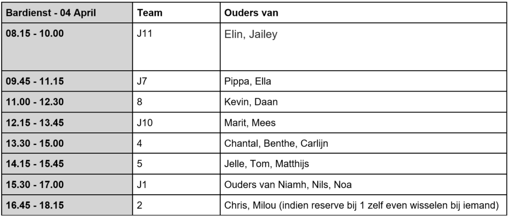Hierbij het rooster voor de bardiensten van 04 april. Doordat 4 april het paasweekend is zou het kunnen zijn dan wedstrijden verzet worden, maar tot nu toe is het schema als volgt. Mocht je niet kunnen volgens onderstaand schema, regel dan zelf even iemand anders.