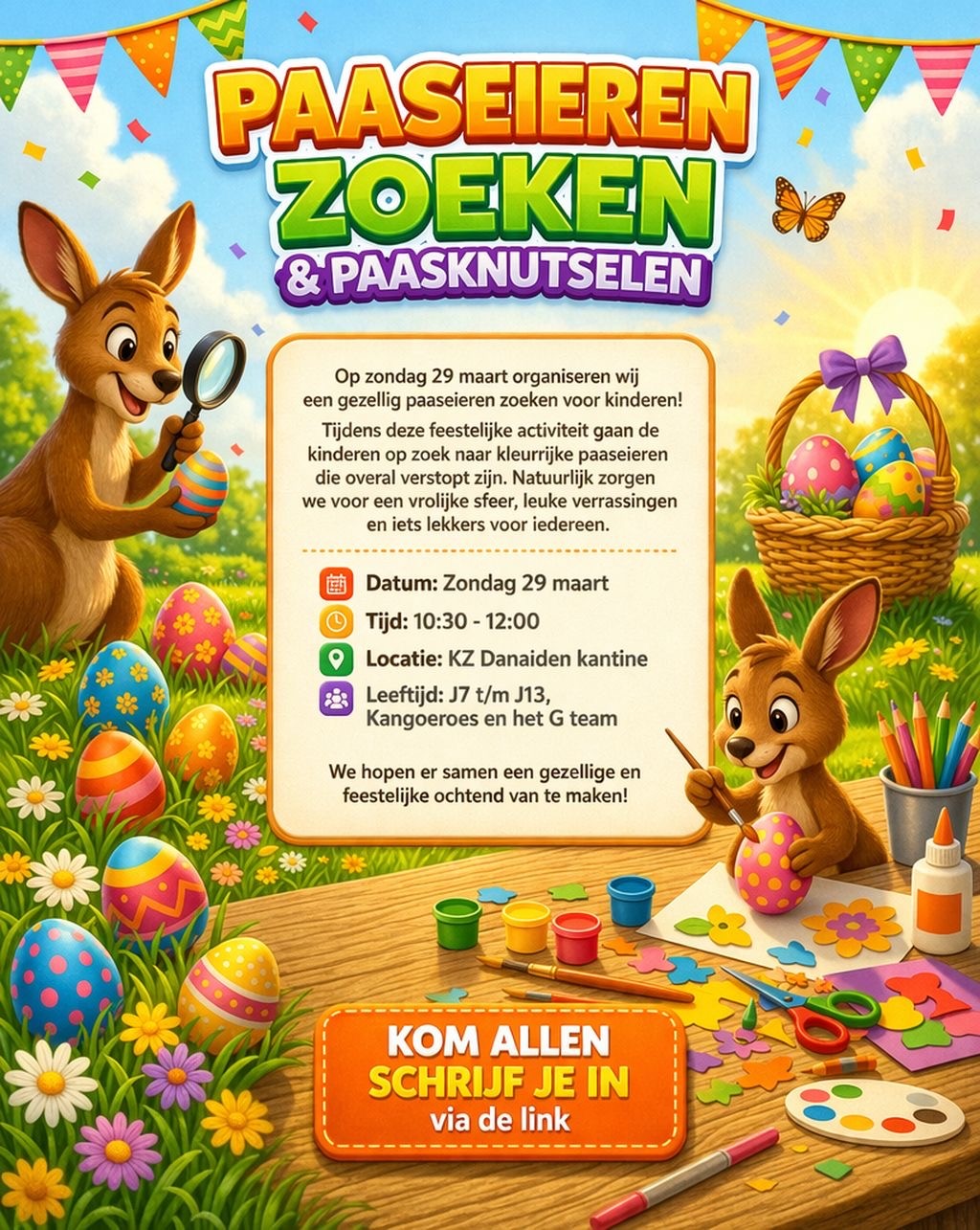 Op zondag 29 maart organiseren wij een gezellig paaseieren zoeken voor kinderen! Tijdens deze feestelijke activiteit gaan de kinderen op zoek naar kleurrijke paaseieren die overal verstopt zijn. Natuurlijk zorgen we voor een vrolijke sfeer, leuke verrassingen en iets lekkers voor iedereen.